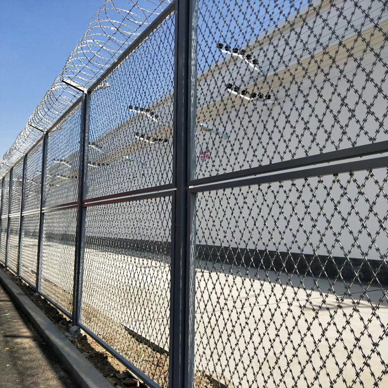 監(jiān)獄護欄網(wǎng)常見的一種是鋼板網(wǎng)式監(jiān)獄護欄網(wǎng),鋼板網(wǎng)式一張整板整體沖壓后制作成網(wǎng)片,然后焊接上邊框立柱,上邊架上刀片刺繩組合而成。監(jiān)獄鋼板網(wǎng)護欄網(wǎng)相比較于普通焊接網(wǎng)片監(jiān)獄護欄網(wǎng),鋼板網(wǎng)的抗裁剪,不開焊,美觀等特點尤為突出。