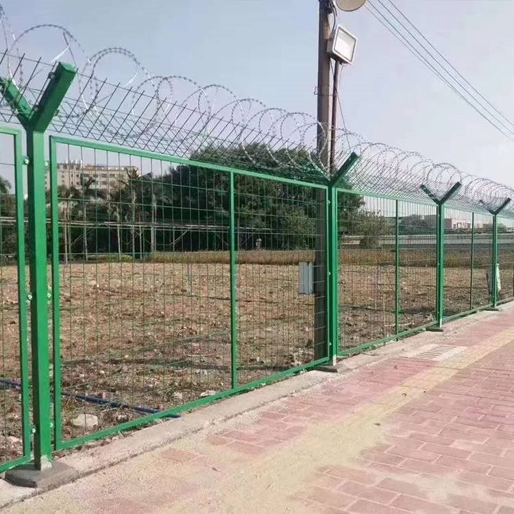 護欄網直接在地面上裝置時,刺繩的裝置辦法有兩種: Y型裝置法和直線裝置法。Y型裝置法是裝置滾筒刀片刺繩的辦法;直線裝置法是裝置一般刺繩的辦法,直接把刺繩擺開固定在立柱或獨自的固定架上。