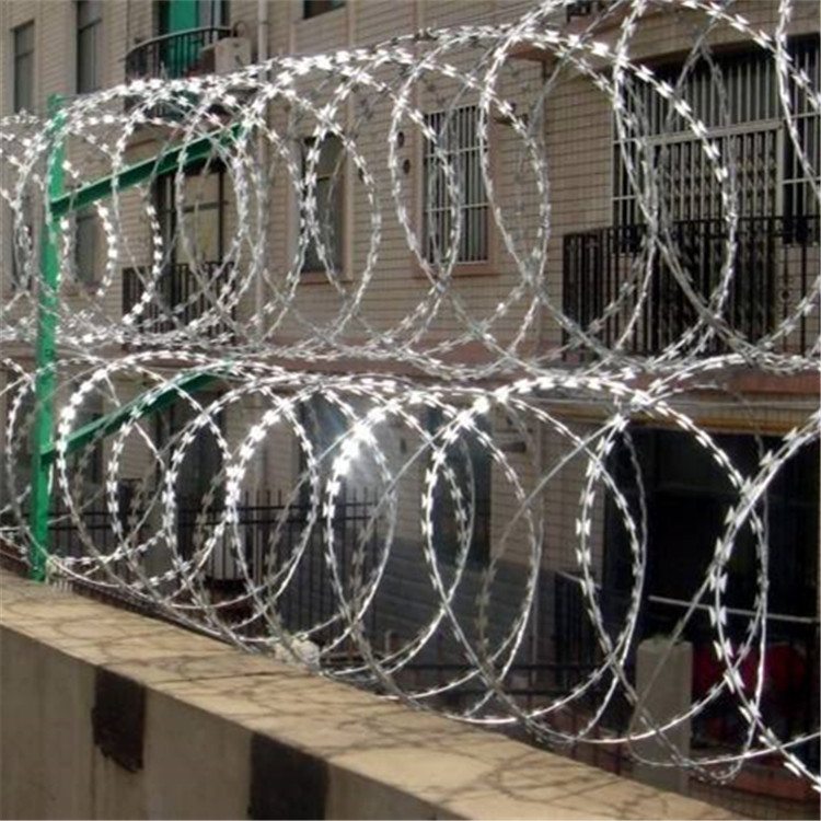 為了加強監獄鋼網墻的高安全性,常有客戶要求鋼網墻的上面在刺網來加強安全性能。刀刺網具有美觀、經濟實用、防阻效果好、施工便利等優異特點,刀刺網常見的表面處理有電鍍鋅,熱鍍鋅和噴塑處理。目前,刀片剌繩已被廣泛應用于許多國家的工礦企業、園林公寓、邊防哨所、軍事領域、監獄、看守所、政府建筑物和其他國家的安全設施。