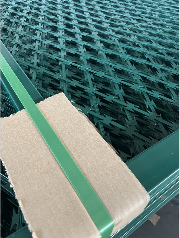 四,接下來就要焊接隔離網(wǎng)了。將焊接好的刀刺網(wǎng)按照施工圖紙對(duì)網(wǎng)面進(jìn)行進(jìn)一步處理,焊接好邊框和立柱后就可以進(jìn)行表面處理了。