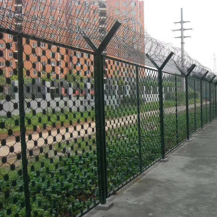 梅花刺網又稱監獄護欄網或監獄隔離柵,主要是采用高強度的刀片刺網.與普通防護網的結合,由V型支架立柱,加強型焊接片網,安全防盜連接件和刀片刺網組成.刀片刺網是一種新型防護網,由銳利尖角鍍鋅鋼板或不銹鋼薄板做刀片,鋼絲做芯線組合而成的防護器材梅花刺網又稱高安全防護網、監獄防護網,是用氬弧焊將梅花形刺片焊接在美格網的節點上,形成刺形保護,有效的防止了手握腳攀,為此該鋼網墻在監獄或看守所使用。